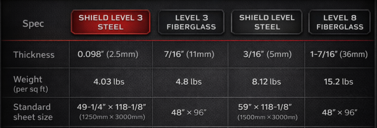Although steel is denser than fiberglass, bulletproof steel is lighter than ballistic fiberglass at equivalent protection levels. Our UL level 3 bulletproof steel is 17% lighter than comparable fiberglass and our UL level 7/8 bulletproof steel is 47% lighter than fiberglass.